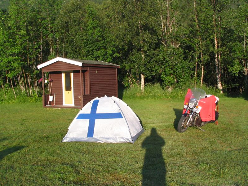 Tuolla tapasimme pari suomalaista pyöräkuntaa, jotka olivat lähteneet reissuun samana päivänä kuin me, mutta olivat menneet Vaasasta Uumajaan laivalla ja olivat 2 päivää ajaneet Ruotsin sateissa ! Minä hiukan ihmettelin että miksi ihmeessä he sinne sateeseen tunkevat kun on poutaisiakin paikkoja missä ajella ! ? Olivat kuulemma parina vuotena reissun tehneet poutasäässä ja luulivat hyvän onnensa jatkuvan edelleen.