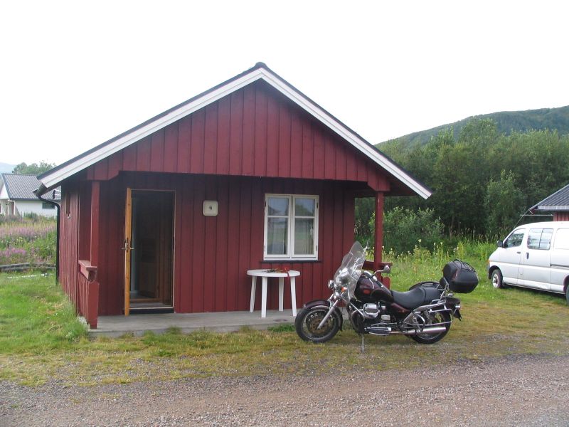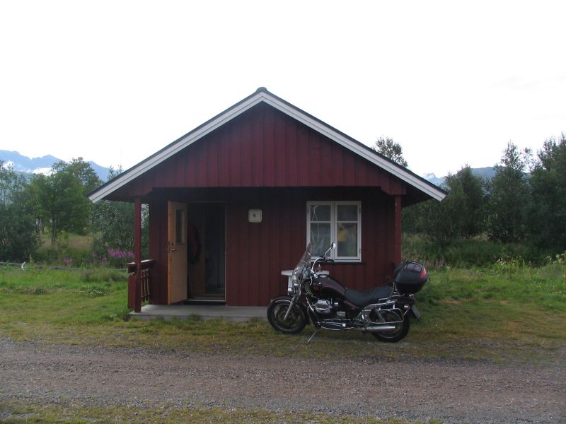 Kuvan mökissä sitten sattui "kummia". Illalla istuskeltiin kaikessa rauhassa upottavalla sohvalla. Siitä kun sitten "liian" reippaasti nousin ylös, venäytin selkäni, jotenkin merkillisesti nousin sieltä syvältä sohvan pohjalta ylös ja sitten aivan yllättäen "jokin naksahti" ja selkä aivan jumissa ! Sukkia en jalasta pois saanut, lattiamallisella jääkaapilla käydessäni piti mennä polvilleni, selkä ei taipunut lainkaan, ihan jumissa. No niin, siinä sitä oltiin Lofooteilla, kaukana kotoa ja kuski ei ole enää ajokuntoinen ! Merja ei ole ikinä moottoripyörää ajanut, ei edes mopoa. Mikä nyt neuvoksi ? Miten täältä päästään kotiin ?