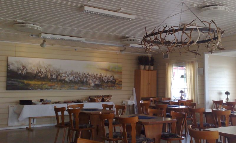 Aamupalaa nautittiin paikallisessa baarissa, jossa oli hieno porotaulu seinällä.