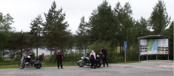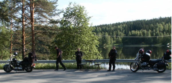 Matkaan lähdettiin auringon paistaessa, ensimmäinen pysähdys tehtiin Kangasalla, jossa sitten tankattiin ja juotiin kahvit. Jossain Oriveden paikkeilla oli tien korjausta ja auto letkat olivat aikamoiset, ja tietysti mekin sitten tällaiseen letkaan jouduttiin ja kun vihdoin päästiin liikkeelle jouduimme lähes heti taas pysähtymään kun osa edellä menevistä autoista vain päästettiin jatkamaan matkaa. Noh, tuli siinä sitten ainakin paahtavassa auringon paisteessa maisemia katseltua ja hiki valui pitkin kasvoja. Ajovarusteet eivät ole kovinkaan vilpoiset pitää päällä. Hetken levähdyksen jälkeen matkamme sitten jatkuikin ja ilman taukoja ja pysähdyksiä ajettiin Jyväskylään asti, jossa jouduttiin taas tankkaamaan. Anu ja minä mietimme mahdammekohan kestää koko matkan kun tuokin pätkä sai takaliston todella puutuneeksi. Matkan aikana tuntui kuin järvet olisivat vain kasvaneet, sillä yhä enemmän silmien eteen avautui vesi maisemaa, jota oli mukava ihastella kun moottoripyörän takana istuskeli ja kyllä varmaan kuskitkin maisemia katselivat ajaessaan. Maisemista tosin olisi voinut nauttia hieman enemmänkin jollei takamus olisi pirhanan nopeasti puutunut, kun ei sitä niin kauheasti moottoripyörän kyydissä ole tullut oltua. Kuten jo aikaisemmin totesinkin sinirtävää vettä näkyi lähes joka paikassa ja niin sitten pysähdyttiinkin jonkin järven rantaan varpaita uittelemaan (Late ja Jaska) ja kuulemma sekin piristi. Ensimmäisiä matkakuvia alettiin näpsiä tässä vaiheessa ja sitten ykskaks Jaska huomasi että filmiä hänen kamerassaan oli, mutta kameran virta oli loppuun kulutettu J.