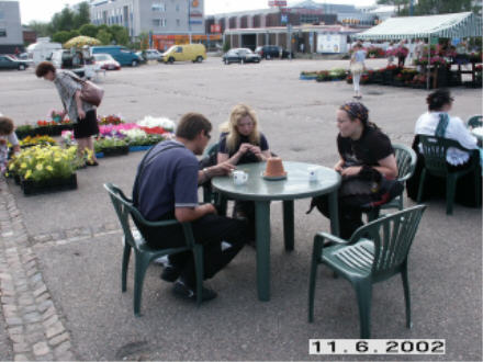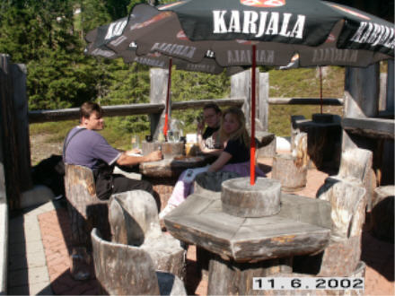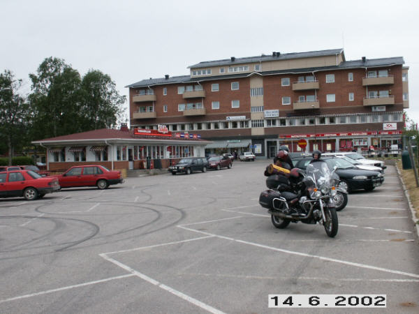 Syömisen jälkeen kaikki neljä mentiin sitten Jaskan ja Anun mökkiin tutkimaan karttoja ja sää ennusteita, jotta huominen ja ehkä jo koko viikon matkareitti saataisiin selvitettyä. Ja ainakin Suomen teitten osalta reitti selvisikin. Ja sitten painuttiin pehkuihin… Päivän kilsa määrä oli tältä päivältä 420 km. Tiistai 11.06. 2002 Ensimmäinen yö teltassa…..voi kauhia….yritä siinä sitten nukkua kun joku kuorsaa varsin äänekkäästi ihan vieressä. Teltassa oltiin hereillä jo kello 5.00, vaikka kuinka yritettiin nukkua. Siitä ei kuitenkaan mitään kummoista tullut. Anu ja Jaska vetelivät hirsiä ties kuinka pitkään J Päivän rundi alkoi heti kun saatin jonkinlaista aamiaisen tapaista syötyä, tavarat pakattua, ja matkareitti vielä varmistettua matkaan siis lähdettiin ja suuntamme tänään oli seuraava Kuopio- Iisalmi- Kajaani- Suomussalmi- Kuusamo- Kemijärvi- Sodankylä. Tästä päivästä kehkeytyi oikein toripäivä, ensin pysähdyttiin Iisalmessa, kun kahven tarve piti tyydyttää ja kyllä se torimeininki siellä oli hieman ankean puoleinen. Torilla oli muutama kukkakauppias, kalakukkokauppias, laukkukauppias, ja hieman muuta. Tori kahviloita kaksi tai enemmänkin ja niissä sentään olikin vilkkaasti ihmisiä. Kahvia ryystäessä sitten päätettiin poiketa Kajaanin torille, joka on Anun opiskelu paikkojen lähellä. Syntyperäisinkin Anu sieltä taisi olla *olkakoho * en muista tarkkaan. Kajaanin tori osoittautui paremmaksi kahdesta toripaikasta, mutta siellähän sentään oli kaikkea hieman enemmän kuin Iisalmessa J