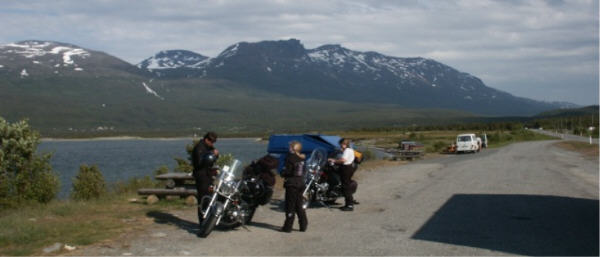 Tornijoki, kiemurteli hyvän matkaa aivan tien vieressä, ja saatiin ihailla suomalaisen kovaa virtaavan joen juoksua. Ja niin tietysti oli pakko mennä ja pysähtyä tien penkalle ja mennä ihastelemaan lähemmin. Ja arvatenkin Late meni kuuluisaan Tornionjokeen varpaitaan kastelemaan. Kilpisjärvi, viimeinen paikka ennen Norjan rajan ylittämistä. Pyörät tankattiin, juotiin viimeiset suomalaiset kahvit, käytiin ostamassa suomalaista evästä, ja mainittakoon niistä reissumies-tuote. Tien vieressä kohosi jylhä Saana, joka oli upea ilmestys ohi ajaessamme.