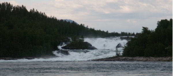 Stortjordissa pysähdyttiin myöskin pikaisesti maisemia ihailemaan. Vuoria, vihreää metsää, kumpuilevaa maastoa, putouksia, puroja ja vettä. Vuorten nimetkin kartasta vilkaistiin, mutta nyt on jo niin vuorien nimet mennyt sekaisin, etten tiedä oikein mikä vuori milloinkin on kyseessä, joten jätän ihan mielelläni mainitsematta nekin J. Andsel…"paikkakunta” jossa sitten yövyimme seuraavan edessä olevan yön. Leiripaikan löytäminen tosin oli aika haasteellinen tehtävä, mutta itsepintaisina matkaa jatkettiin pikkutietä pitkin eteenpäin ja niinhän se löytyi kuin löytyikin jopa pari kappaletta mökkipaikkoja. Me valitsimme niistä kauimmaisen, Nedre Målsevfossen Feriesenter. Paikka osottautui kalastajien oleskelupaikaksi, jonka vierellä jylisi yksi suuri koski, jota Late ja minä sitten menimme lähempää katsomaan. Anu ja Jaska jäivät paistamaan makkaraa . Mökki missä yövyimme, oli neljän hengen, jossa oli oikein ruhtinaalliset oltavat. Kaksi makuuhuonetta, joissa molemmissa kerrossängyt, oleskelu huone+ keittiö samassa, suihku ja vessa. Ei valittamista tästä mökistä ainakaan tullut mieleen.