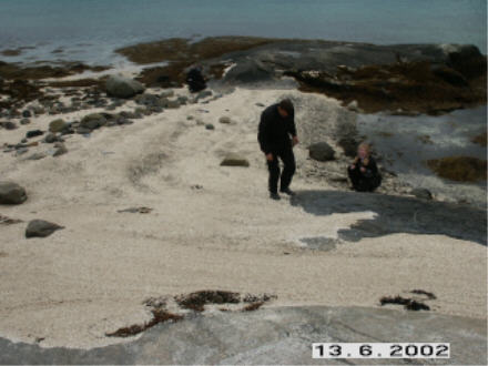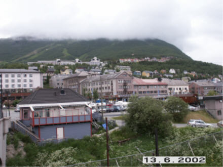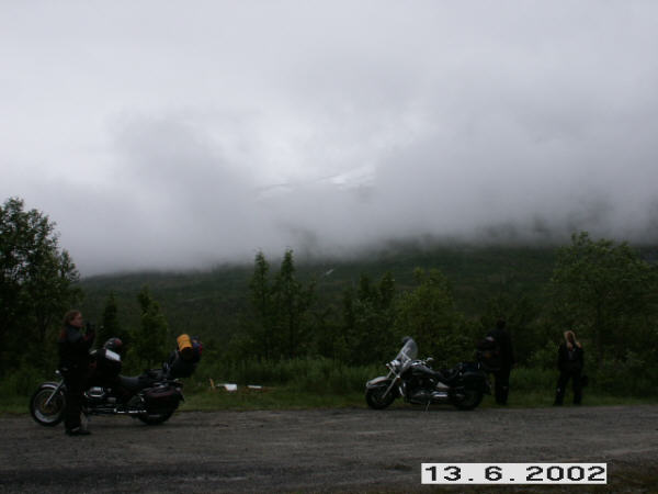 Päivän matka mittariin upposi tältä päivältä 710 kilsaa joka oli kyllä aivan liikaa, illalla ei meinaan mielellään kauheasti pehmeällä istunut vaan mieluummin kovalla alustalla tai sitten tyytyi seisomaan joka sekin tietysti oli oiva idea monen tunnin istumisen jälkeen J Keskiviikko 12.06.2002 Herätessä tuntui kuin olisi saunaan nukahtanut, sillä kyllä tuossa auringon paisteessa olevassa kahden hengen mökissä olikin kyllä kuuma ja varsinkin kun yöllä oli mennyt käpertymään lämpimään makupussiin…argh! Tällä kertaa tosin tuli nukuttua hyvin ja pitkään, ja kaiken lisäksi tällä kertaa minut jouduttiin herättämään J Liikkeelle lähdimme yhdeksän maissa kun kaikki taas oli pakattu mukavasti mukaan. Päivän suunta: Sodankylä- Kittilä- Muonio- Karesuvanto- Kilpisjärvi- RAJA- Nordjosbotn- Stortjord- Andselv Lämmin aamu, tai siltä se ainakin tienristeyksissä tuntui kun jouduttiin aina hetkisen pysähdyksissä olemaan. Kittilässä juotiin aamukahveet ja sen jälkeen nähtiin päivän ensimmäinen poro lönköttelemässä keskellä tietä ja tietenkään se ei väistänyt jolloin, jouduimme sen ohittamaan. Muoniossa tehtiin pikavisiitti, eli vaihduttiin vain valuttaa Norjan kruunuiksi. Paikallisen miehen kanssa päiviteltiin kuumuutta jota kuulemma oli jo kiitettävän aikaa riittänyt. Karesuvannolla pysähdyttiin tankkaamaan ja sitten mentiin matkamuisto kaupassa käymään siinä vieressä. Ja siellä sitten tehtiinkin ensimmäiset matkamuisto ostokset. Kaupan pihalla oli pari aivan ihastuttavaa rumilusta, joista yksi taisi olla hirvi, toinen joulupukki ja kolmas……? Pääasiassa kaikki kolme olivat väriltään vihreitä, ihastuttavaa sekin.