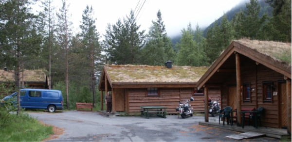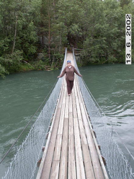 Suurin osa mökeistä oli viiden hengen ja sehän kävi hyvin meille. Mökin kattona oli komea turvekatto ja mökkien takana, pienen matkan päässä jylisi Junkerdalsura niminen koski, joka mökkien kohdalla oli muuttunut vauhdikkaaksi joeksi, jonka yli muuten vei riippusilta. Ja tuota samaa koskea me olimme pysähdytty katsomaan tuon ed. mainitun jyrkän tien reunaan. Videonpätkä jyrkänteeltä rotkoon tästä: rotko (2,94 Mt) Riippusiltaa pitkin kävely oli aika jännää, kun silta heilui ja vesi kohisi villinä alapuolella. Ei paljoa tehnyt mieli alas kurkkia saatikka ajatella joutuvansa virtojen vietäväksi. Ja jokaisen askeleen kohdalla tuntui, että koko riippusilta tukijalkoineen heilui!