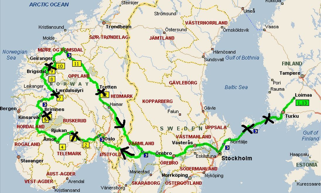 Heinäkuun viimeinen viikko Norjassa. Matkareitillä mustat rastit ovat yöpymispaikkoja, numeroilla ei ole merkitystä.