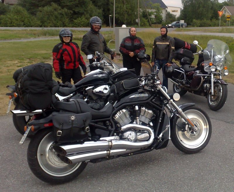 Tällä kertaa reissuun lähti muitakin Peräkylän Motoristeja. Tähän asti reissuja on tehty vaimon kanssa kahdestaan, paitsi v. 2005 naapurit olivat mukana. Lähtöpaikalla kuvassa vasemmalta Leila ja Harri, Merja ja matkan varrella 600 valokuvaa napsinut valokuvausalan puoliammattilainen Pauli, jonka ottamia suurin osa tämän reissun kuvista on.