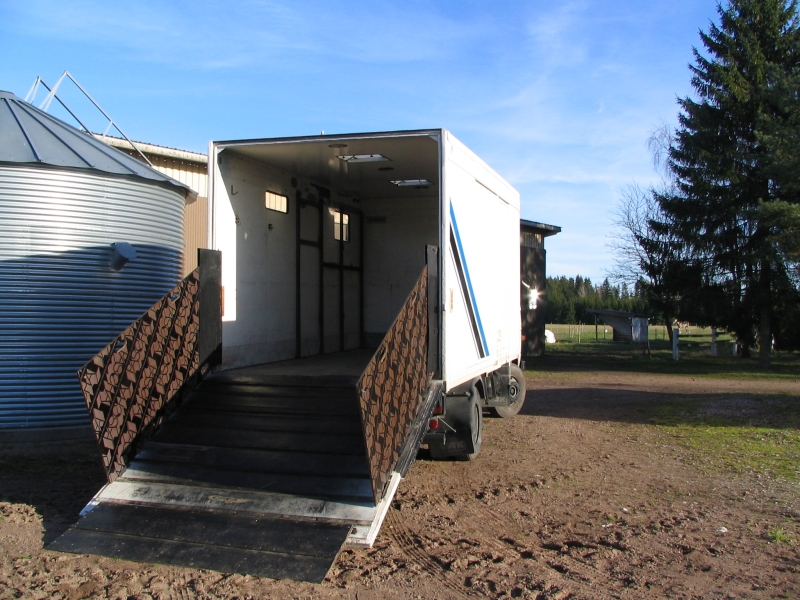 Haemme sen jo pari päivää ennen reissun alkua matkavalmisteluja ajatellen, ensin heitellään reilusti puruja pohjalle. Otamme mukaan väliaitoja sen verran, että niistä saamme rakenneltua koppiin kolme erillistä karsinaa. Tietysti autossa on sähkökäyttöinen hydraulisesti alaskääntyvä perälaita, joka toimii lastausränninä. Mukaan otamme kaiken tarpeellisen; tunkin, avaimia ym työkaluja, jerrykannullisen dieseliä, riimuja, ämpäreitä, vesikanistereita, heinää pikkupaaleissa, paalinarurullan ja puukon.