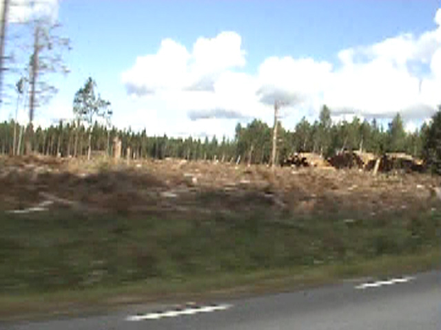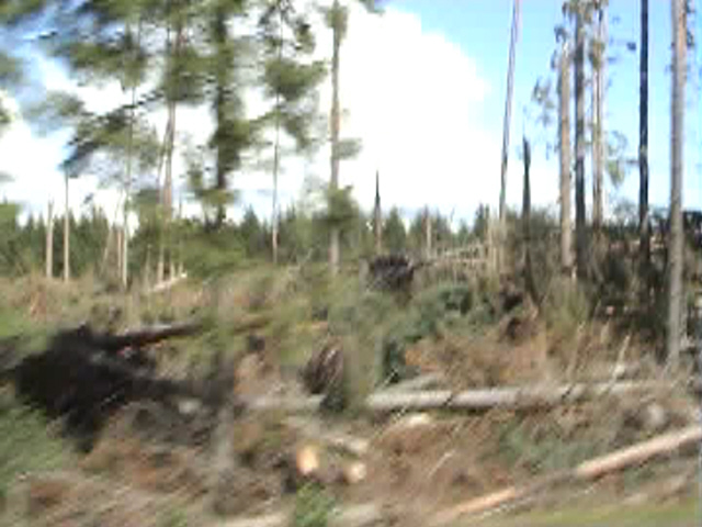 Välillä tulivat mieleen tv-dokumentit toisesta maailmansodasta ja tuntemattomasta sotilaasta, näkymät olivat hyvin samankaltaisia. Paikoin tieltäkin näkyvissä oli kymmeniä ellei satoja hehtaareja täysin nurin menneitä metsiköitä. Raivaustyöt olivat täydessä käynnissä vieläkin, motoja korjaamassa puuta talteen. Varmaankin aika hankalaa työskennellä kaiken tuon sekamelskan keskellä. Paljon oli jo korjattu puuta talteen, valtavia puupinoja näkyi siellä täällä varastoalueilla ja kastelulaitteet koettivat pitää puutavaran tuoreena, samalla pinot kuitenkin olivat kastelun seurauksena muuttuneet lähes mustiksi.