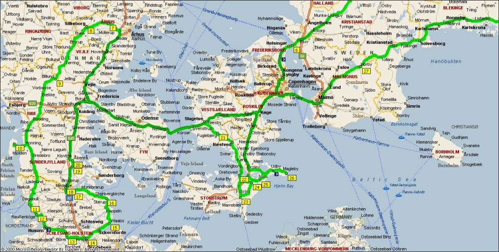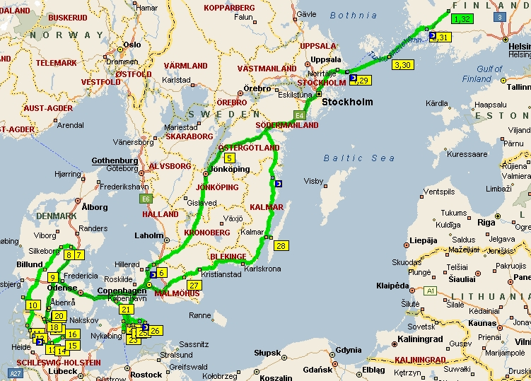 Ensimmäinen yöpyminen Vättern järven paikkeilla, siinä "keskellä" eteläistä Ruotsia (n:o 5 kohdalla)