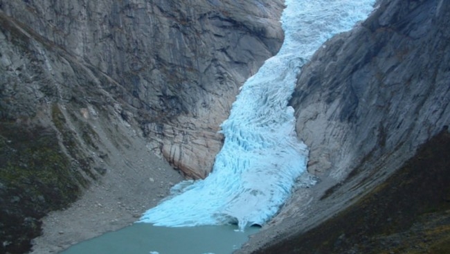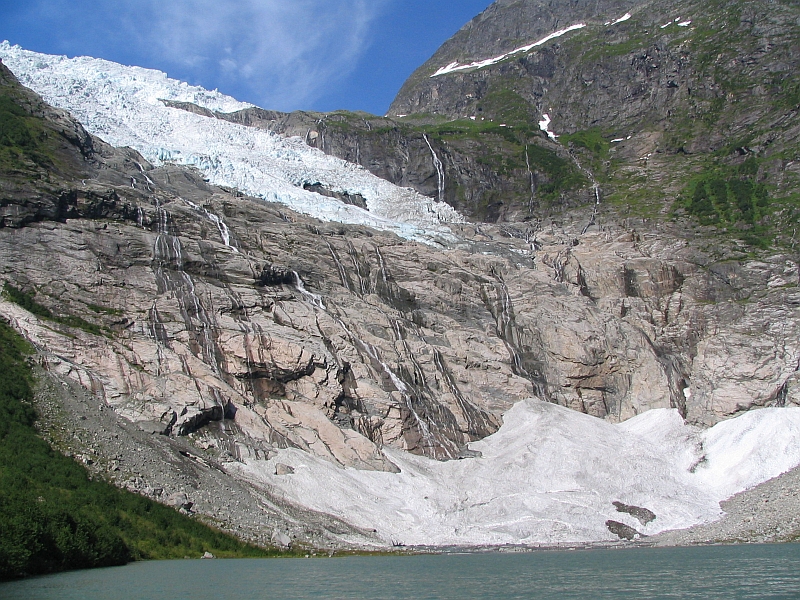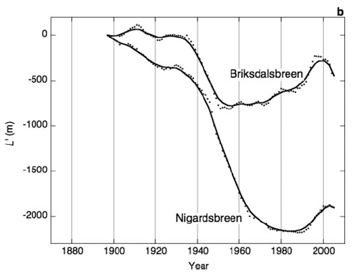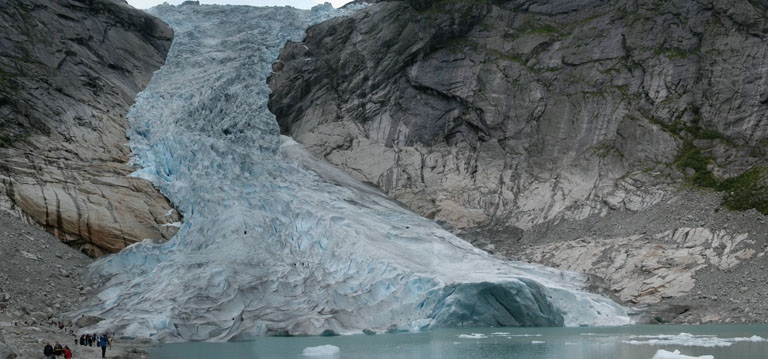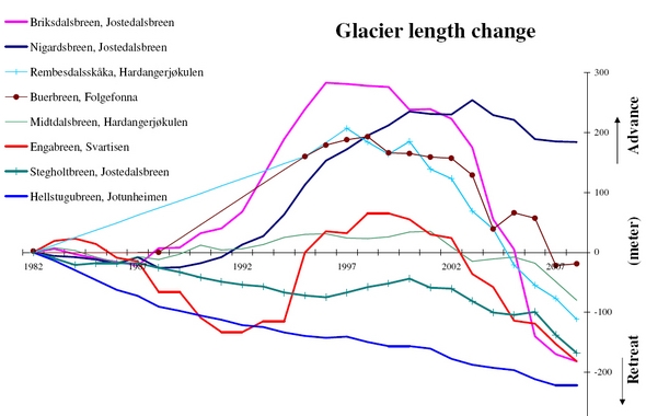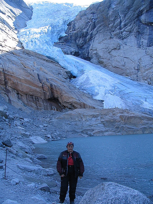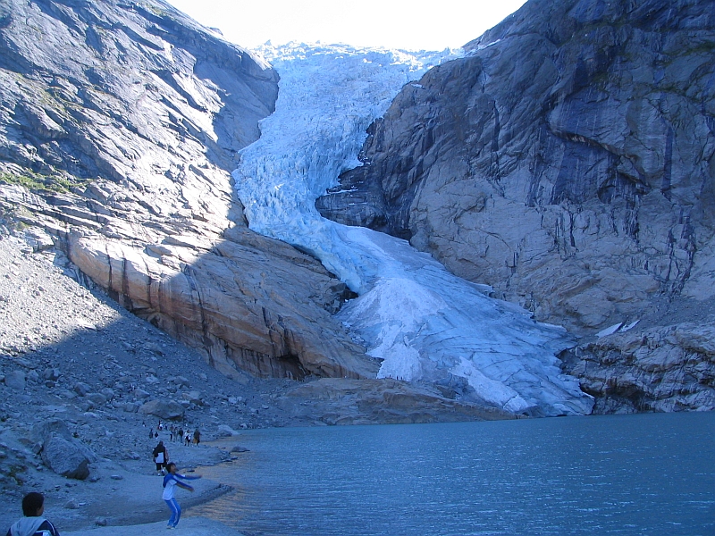 Jostedalsbreen suli kokonaisuudessa pois 7600 vuotta sitten, jolloin maan lämpötila oli 0,7 astetta nykyistä lämpimämpi. Sitten taas ilmasto kylmeni ja jäätikkö syntyi uudelleen kasvaen 1600 ja 1700 luvuilla suurimmilleen, jolloin oli ns. pieni jääkausi. 1740-luvulla jäätikkö oli suurimmillaan ja sen jälkeen jäätikkö on vuoroin kasvanut ja pienentynyt. Löysin netistä pari jäätikön kehityskäyrää, ensimmäinen vuosilta 1900-2000 ja toinen vuosilta 1982-2008. Seurataan Briksdalsbreenin käyriä.