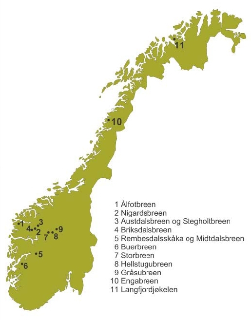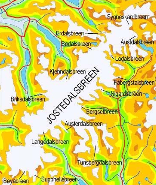 Norjan jäätiköt sijaitsevat enimmäkseen täällä "Loimaan" leveysasteilla.