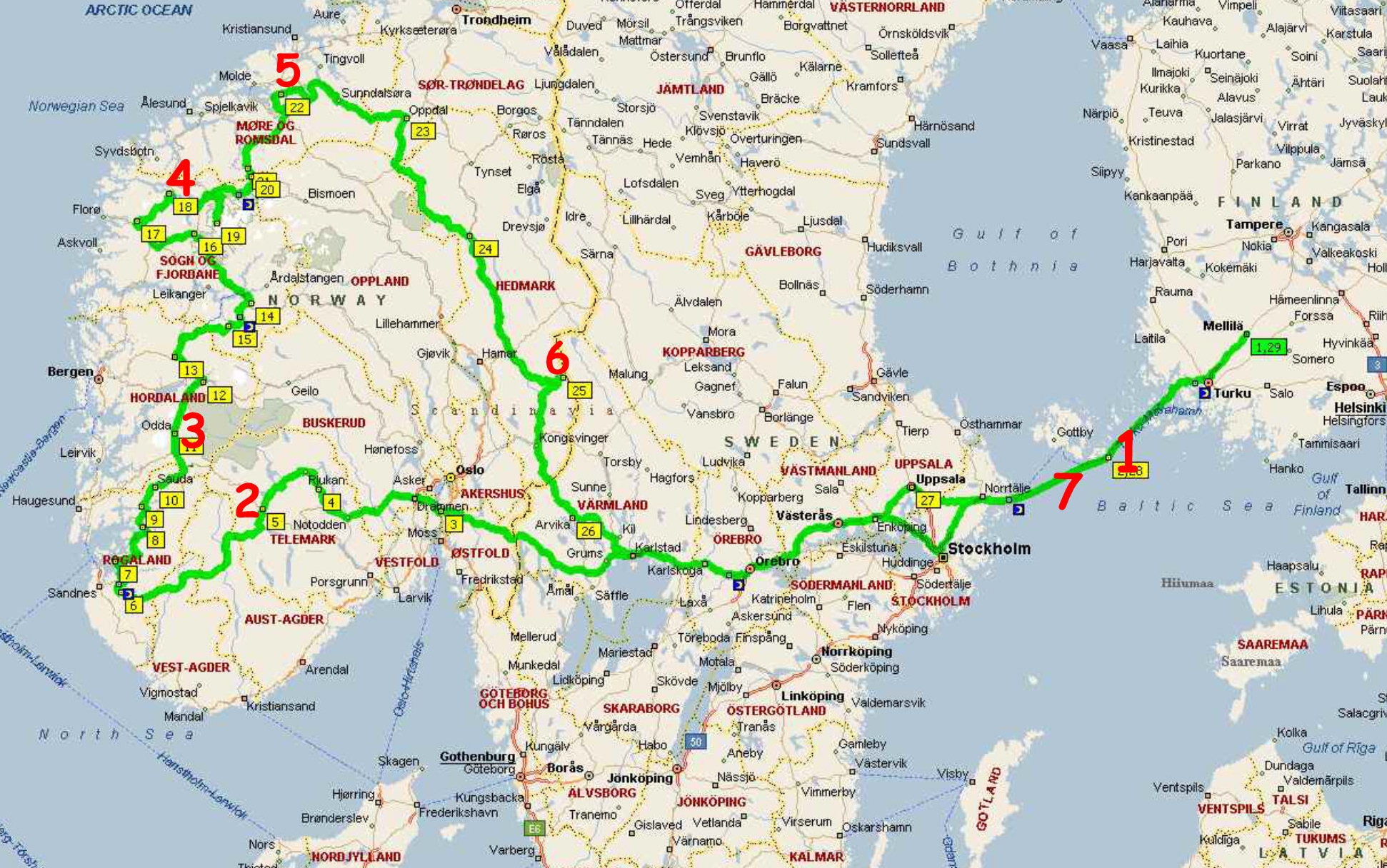 Vuosi 2007 oli välivuosi Norjan matkailun suhteen, silloinhan siellä satoi jatkuvasti, mutta nyt oli onni mukana säiden suhteen ! Heinäkuun viimeiselle viikolle saapui lämmintä ilmaa Suomeen ja hellettä Norjaan. Vaimo oli lomilla oikeaan aikaan ja I heinäsato oli saatu juuri edellisellä viikolla paaliin, joten ei muuta ku menox sano Annie Lenox ! Kesän ajot voi muuten laskea yhden käden sormilla, kun oli se susiaitaprojekti työn alla kuukausikaupalla. Kuvassa on reitti ja yöpymispaikat numeroitu.